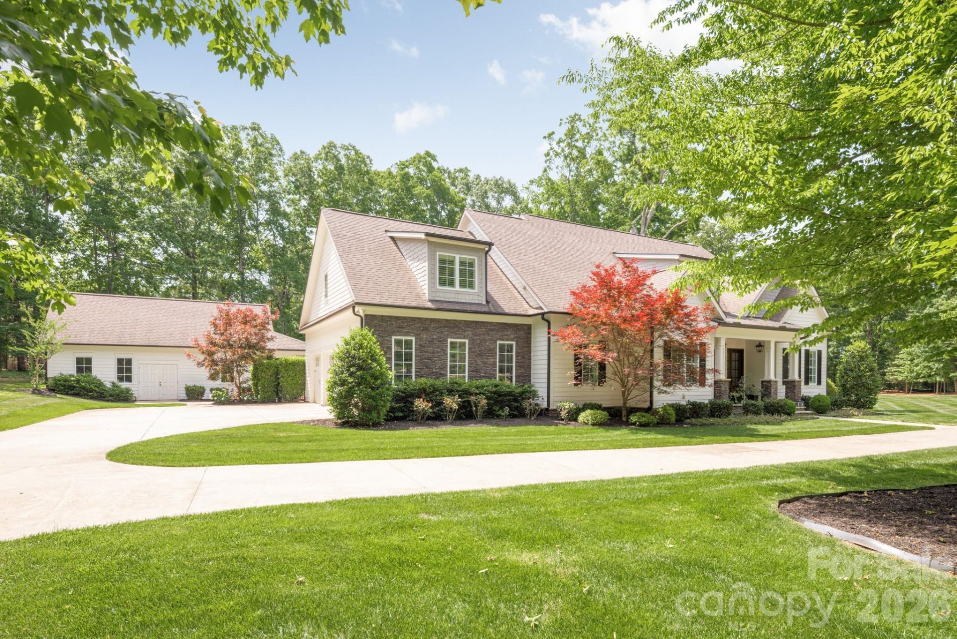 Looking for a luxury estate with land surrounded by nature, but still within minutes of shops, restaurants and work? This thoughtfully designed custom home with pool and pool house sits on over 3 acres abutting the Buckeye Cove preserve and trails. Designed for both functional daily living and entertaining, the main floor includes both a primary suite and guest suite with zero entry shower and wide entries to accommodate all guests. The primary bath features a large freestanding tub, oversize shower and the large vanity include drawers with outlets and storage for accessories. As you enter from the covered front porch to the 12' foyer you'll notice an office with vaulted ceiling and stained beams and a spacious dining room with coffered ceiling and wainscotting. Venture further into the home and you'll immediately notice the wall of windows and light that floods the home and the greenery of the yard and trees beyond. The high ceilings and custom stonework around the large gas fireplace make the space welcoming without being stuffy and create the ideal backdrop for either a grand holiday gathering or a quiet morning coffee. Just off the great room is the door to the backyard and screen porch, kitchen and breakfast nook with built-in bench with storage. Should you need more storage, the kitchen provides additional storage space with full height cabinets, including a hidden microwave and appliance shed with pull-out shelves to leave everything in place while in use. The 48 Thermador Range includes 6 gas burners, a griddle and 2 separate ovens. The built-in Thermador Fridge and Freezer columns have ample space, especially when you can store wine in the built-in wine fridge. Tucked away behind the entertaining areas of the home are the guest suite, laundry, mud room, access to the 3 car garage and the cozy den that includes French doors to the screen porch so you can enjoy the fresh air and sounds of the spa waterfall while you work or relax. If the outdoors are calling, there's no better place than this yard. A screen porch, private saltwater pool and spa and the separate pool house that is an entertaining showstopper. The large garage window over the indoor/outdoor wet bar with under counter fridge and icemaker, means the party flows inside and out. Surround sound, a full pool bath and storage closet for all the swimming supplies means everyone will want to spend all summer here! If staying healthy and working out in the air conditioning (or heat!) is what you prefer, the pool house also includes a large gym with a large picture window. If you venture back inside and upstairs you'll find a large bonus space with space to enjoy movie night, complete with built-in snack bar and storage, game night, playroom or whatever flexible space you envision. The two remaining mirror-image bedrooms are off the bonus room and include large walk-in closets a dormer window nook perfect for a desk or reading chair. Each room has a private vanity area that lead to a s