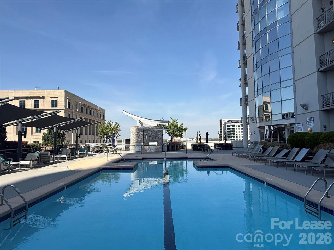 Experience Uptown living in this studio style condo in the desirable Trademark Condominiums. Located on the amenities level, the unit features high ceilings and a large private patio with direct access to the rooftop Sky Terrace pool deck. From the patio and pool area you have open views toward Bank of America Stadium, Knights Stadium, and Romare Bearden Park, making it a great spot to catch stadium fireworks. The kitchen features black painted cabinets, and the open layout provides a comfortable and functional living space.Residents Amenities include the pool and terrace deck area with grilling area and a fitness center. Additional amenities include a package delivery hub, community kitchen area and a Club Room for gathering together. The unit includes one reserved parking space in the secured parking garage. Located in Uptown Charlotte with convenient access to restaurants, museums, nightlife, and sporting events.