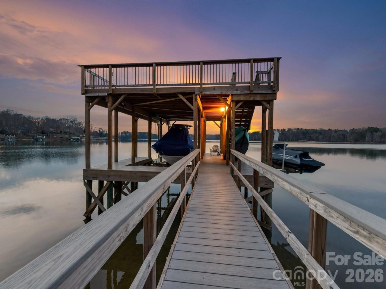 Extraordinary Waterfront Living on Mountain Island Lake. It's all about the Lake!An Outdoor Oasis & Entertainer's Dream!Tucked discreetly away from the street, this one-of-a-kind luxury waterfront estate delivers what lake living is truly about?unparalleled panoramic views of Mountain Island Lake. With commanding sightlines across open water, the home faces the protected shoreline of Latta Nature Preserve's 1,500 plus acres, ensuring lasting privacy and freedom from future congestion. Approximately 20 minutes from Uptown Charlotte, this property offers the ideal balance of resort-style escape and everyday convenience.Designed around a striking Fire and Water theme, the home was crafted for elevated entertaining indoors and out, with abundant parking as part of turnaround asphalt driveway and golf cart path and thoughtfully curated spaces throughout.Outdoor Oasis ? Resort Living at Home -The property rivals a five-star resort, anchored by a stunning saltwater pool and hot tub with expansive walk-in steps and dramatic gas fire features. A swim-up bar with submerged bar stools invites relaxation, while covered bar and lounge areas provide dining, seating, and a large-screen television?perfect for game days or evenings by the water.Two outdoor kitchens elevate entertaining, including a restaurant-quality gas griddle and hood with dual warming drawers on the lakeside. A charming gazebo features two water elements?an elongated fountain and a rock-stone fountain?centered around a wood-burning fire pit. A glamping-style guest cabana with mini kitchen offers a unique poolside retreat, while an herb and specialty flower garden space adds fragrance and culinary inspiration.Poolside convenience includes direct access to an oversized bath with dual lavatories, dual showers, and hand-selected ornate grained granite.Waterfront Excellence ? A Dock Like No Other -Newly constructed including new pilings, massive two-tier, double-decker dock built with Trex-style materials offers carefree lake enjoyment. The upper level features Gutter Deck waterproof decking, engineered to stay cooler with superior water-wicking properties?perfect for morning yoga, workouts, or sunset gatherings. The terraced lower level includes a boat lift with 10,000 lbs capacity for your luxury boat. A Rotomag jet ski lift rotates your jet ski to the perfect position, complete with its own access ladder. Extra-wide stairs for kayaks and paddleboards, and a golf-cart path connecting the home to the dock. A lakeside landing with porch swing provides a peaceful place to take in the views.Interior ? Modern Renovation with Artistic Detail -Inside, stone accents, blonde wooden beams, and a warm modern aesthetic continue the Fire and Water theme. Artisan-bleached stonework in den adds refined texture, while the chef's kitchen features top-tier appliances, luxurious leathered Quartzite counters, and a bay window framing lake views. Second laundry area on main level for pool conv